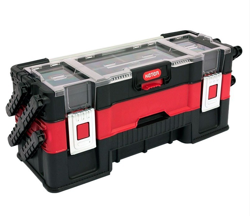 Практичный 3-уровненный ящик большой емкости, каждый уровень которого приспособлен для хранения различного размера инструментов и аксессуаров. Остаётся устойчивым даже при полном открытии.