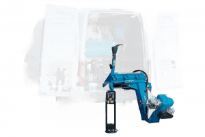- В рабочем положении консоль зажимного устройства наклоняется за пределы двери фургона, что обеспечивает достаточно пространства для нормальной работы с большими колесами, а минимальная рабочая высота - отсутствие необходимости подъема колес.